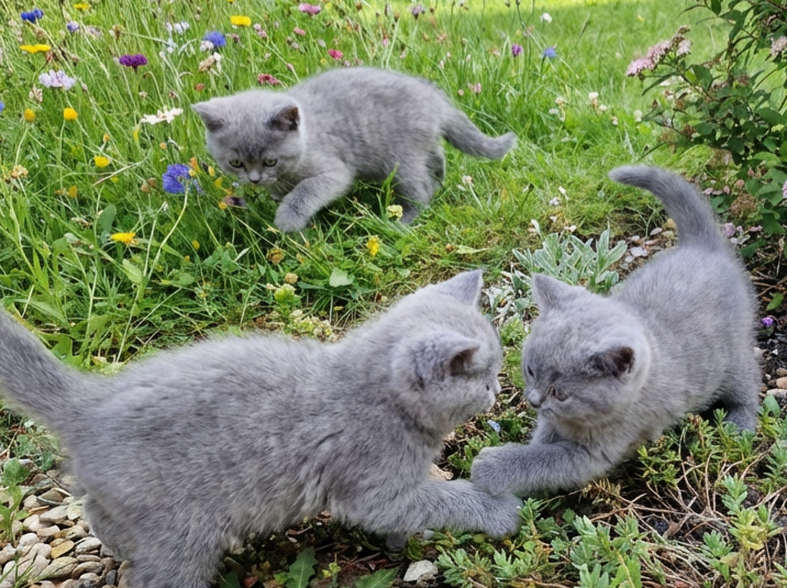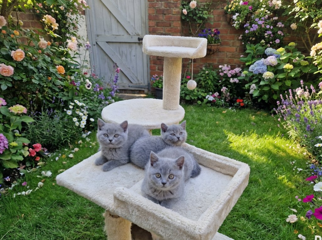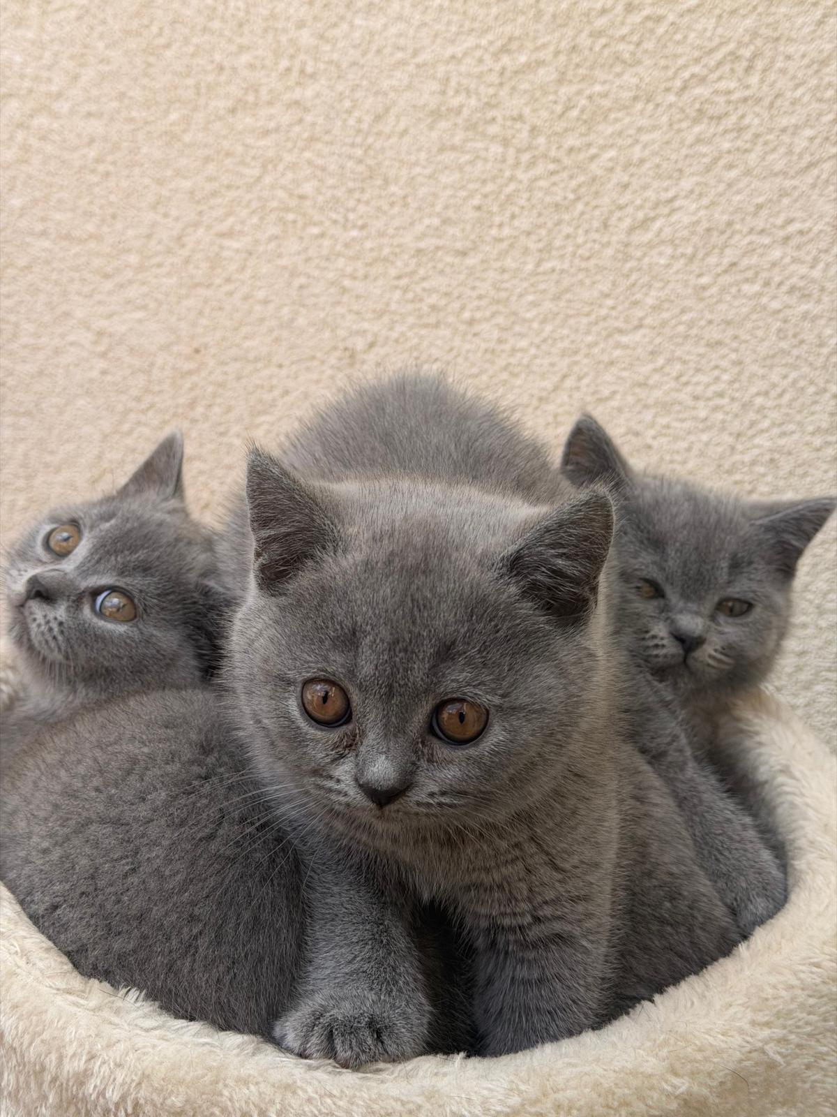 Three charming female kittens are available for sale. These energetic Blue British Shorthair kittens are thriving and full of spirit. Each one has a unique personality and has been raised in a loving environment with other cats and children, making them well-adjusted to the sounds of family life. They enjoy both dry and wet food.