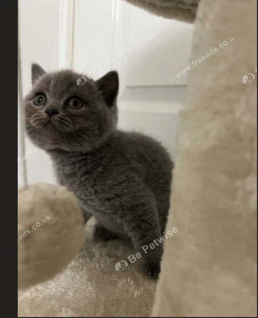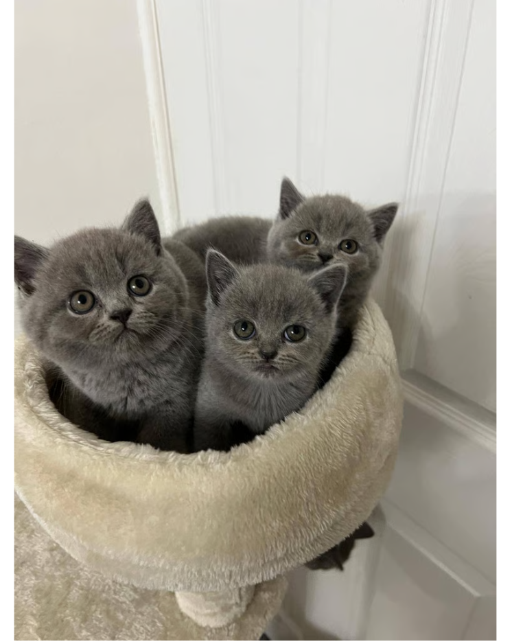 (Two boys and one girl )pedigree Blue British Shorthair kittens are thriving, playful, and brimming with energy. Each kitten boasts a delightful temperament and has been raised in a loving home alongside other cats and children, making them well-adjusted to the sounds of family life. They enjoy both dry and wet food.Their mother is a purebred Blue British Shorthair with a gentle disposition, while the father (stud) is a distinguished gentleman, registered with GCCF and TICA, and is both PKD and PRA negative. These kittens come from exceptional bloodlines, with both parents exemplifying the breed's finest traits. Each kitten is healthy, has undergone a comprehensive veterinary check, and has been treated for fleas and worms. They are also trained to use the litter box and scratch post.