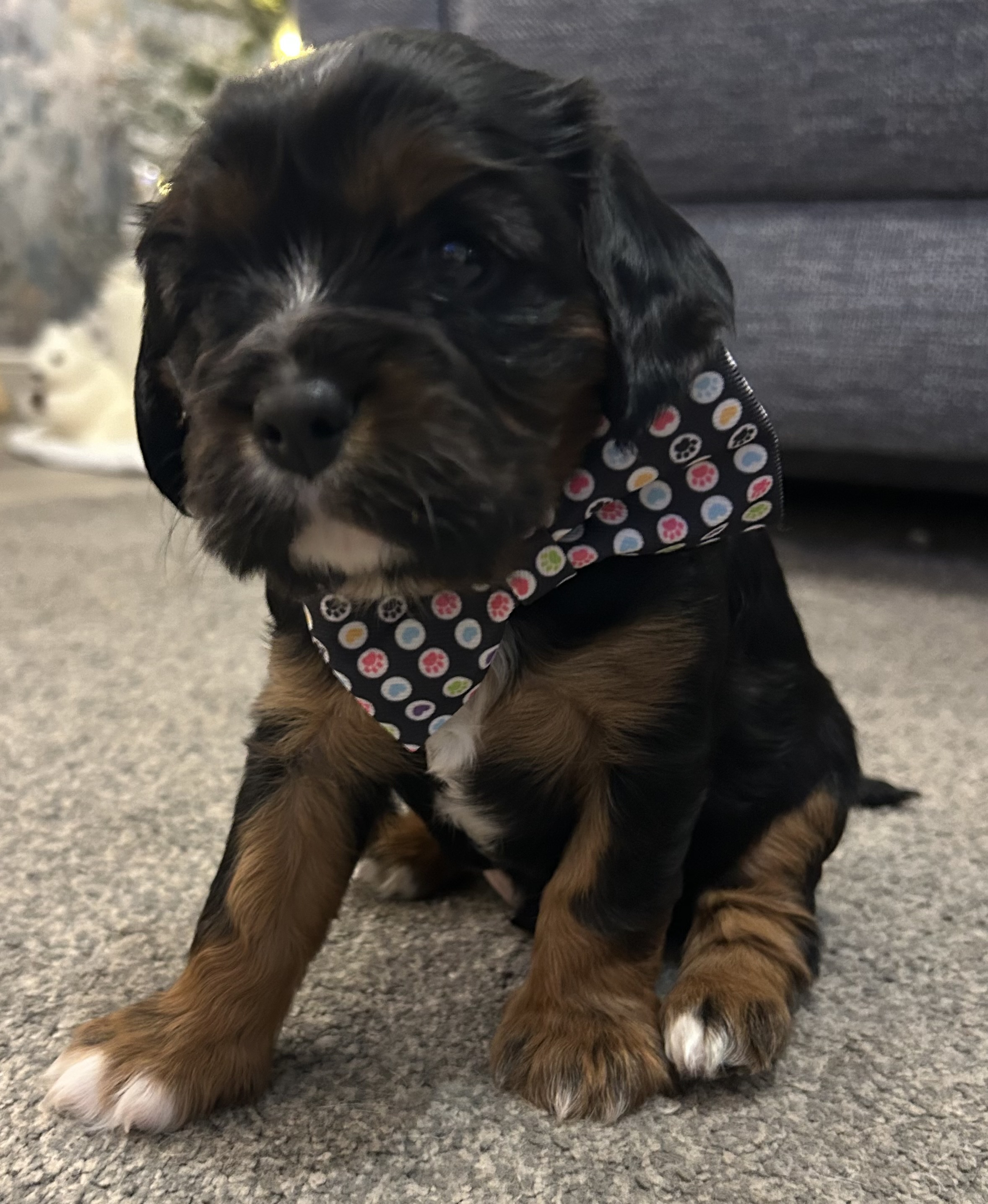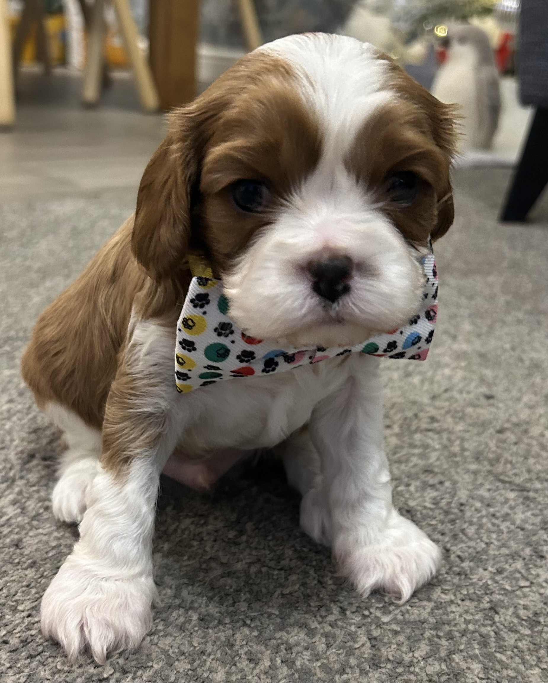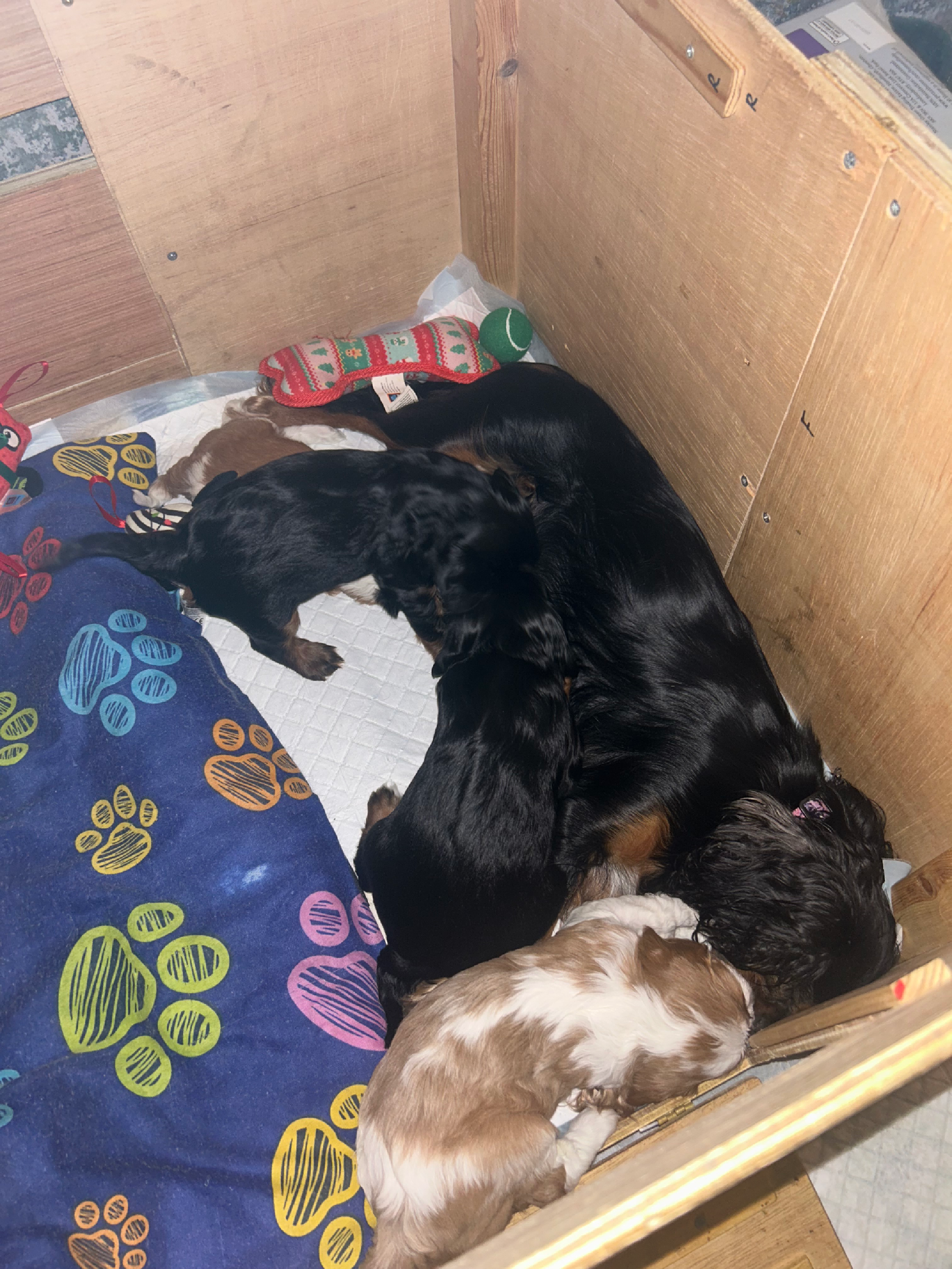 4 boys, two Blenheim and two Black and Tan. Their Black and Tan Mother Lilly is our family pet, she is small and very calm and loving. You would be able to meet her. All the puppies have been well cared for by her in our home. We have other pets and three children so puppies are very loved, sociable and used to noise, children and attention. The dad was a fully heath tested stud who was Blenheim and had a beautiful temperament. We have paperwork, proof of pedigree for both parents and puppies will come KC registered with their own five generation certificate. Viewing is welcomed as they are simply perfect. A deposit would reserve the puppy ready for its forever home for week beginning 22nd December