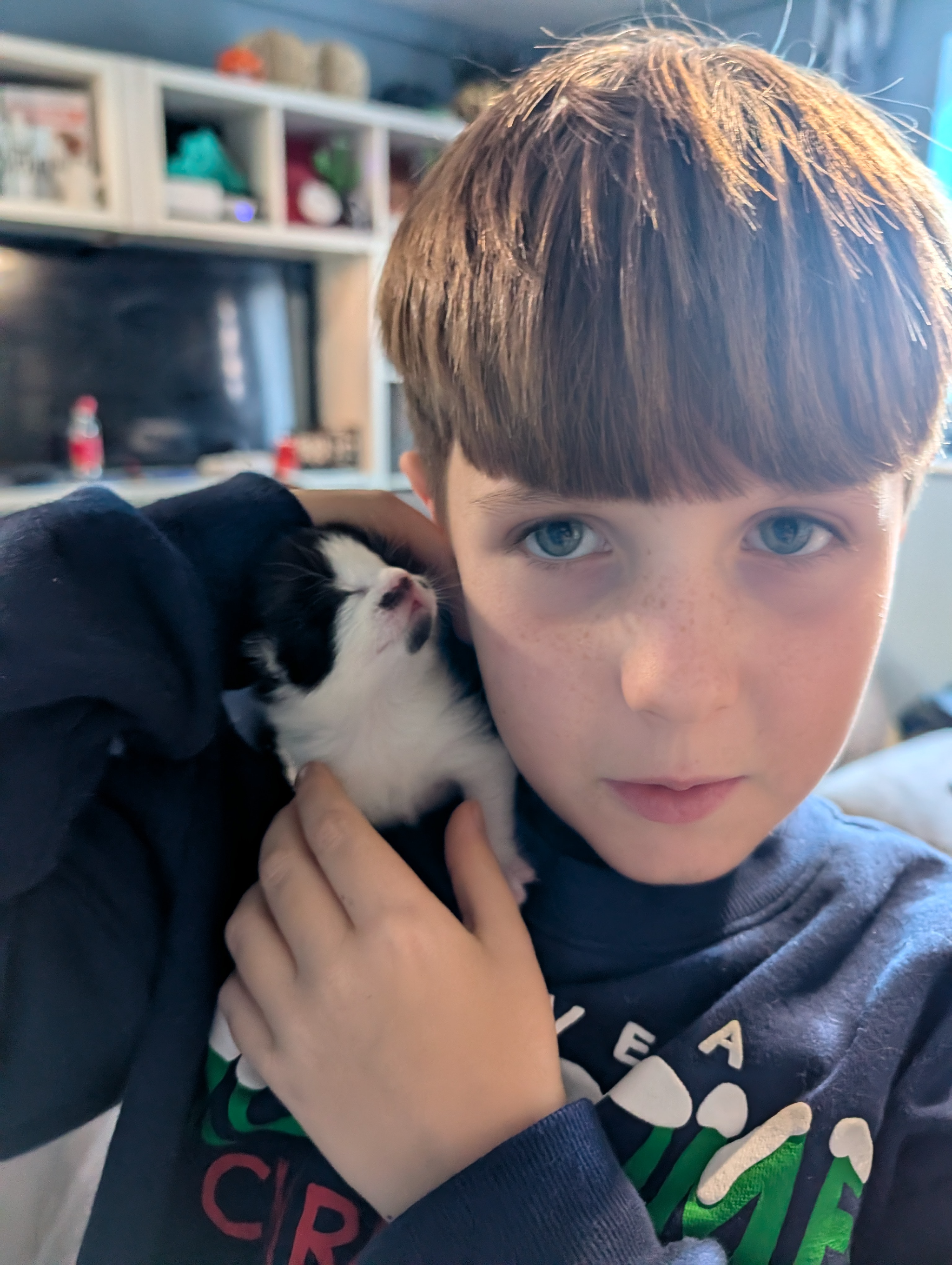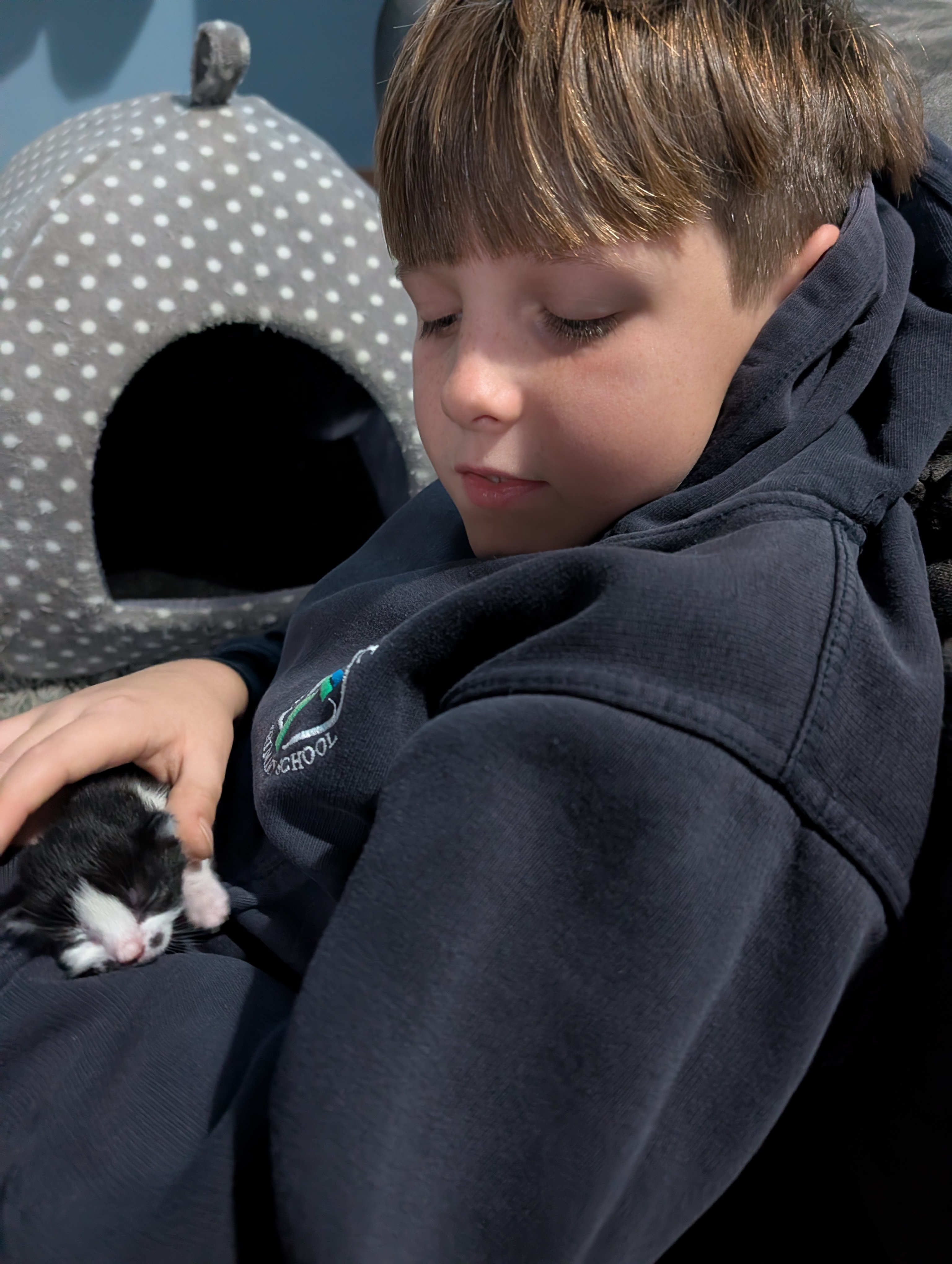 Born on a litter of one and both mum and kitten are healthy. Mum has previously had a healthy litter of two. We think kitten is male but are unsure. Kittens eyes opened over a week ago and has been wobbly walking for a week.