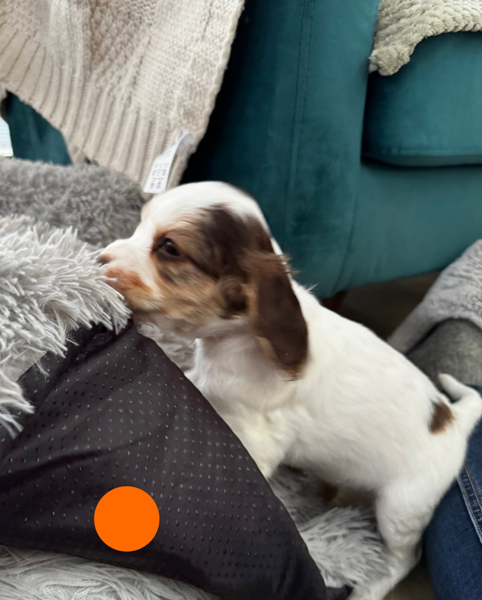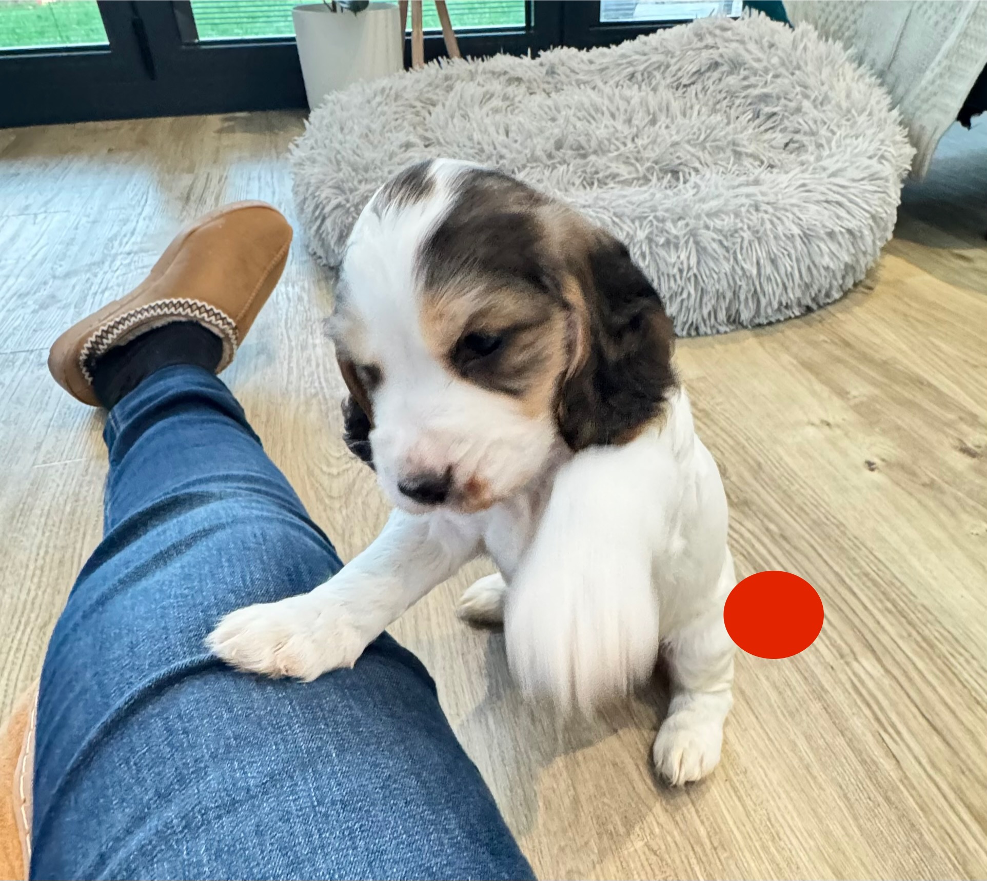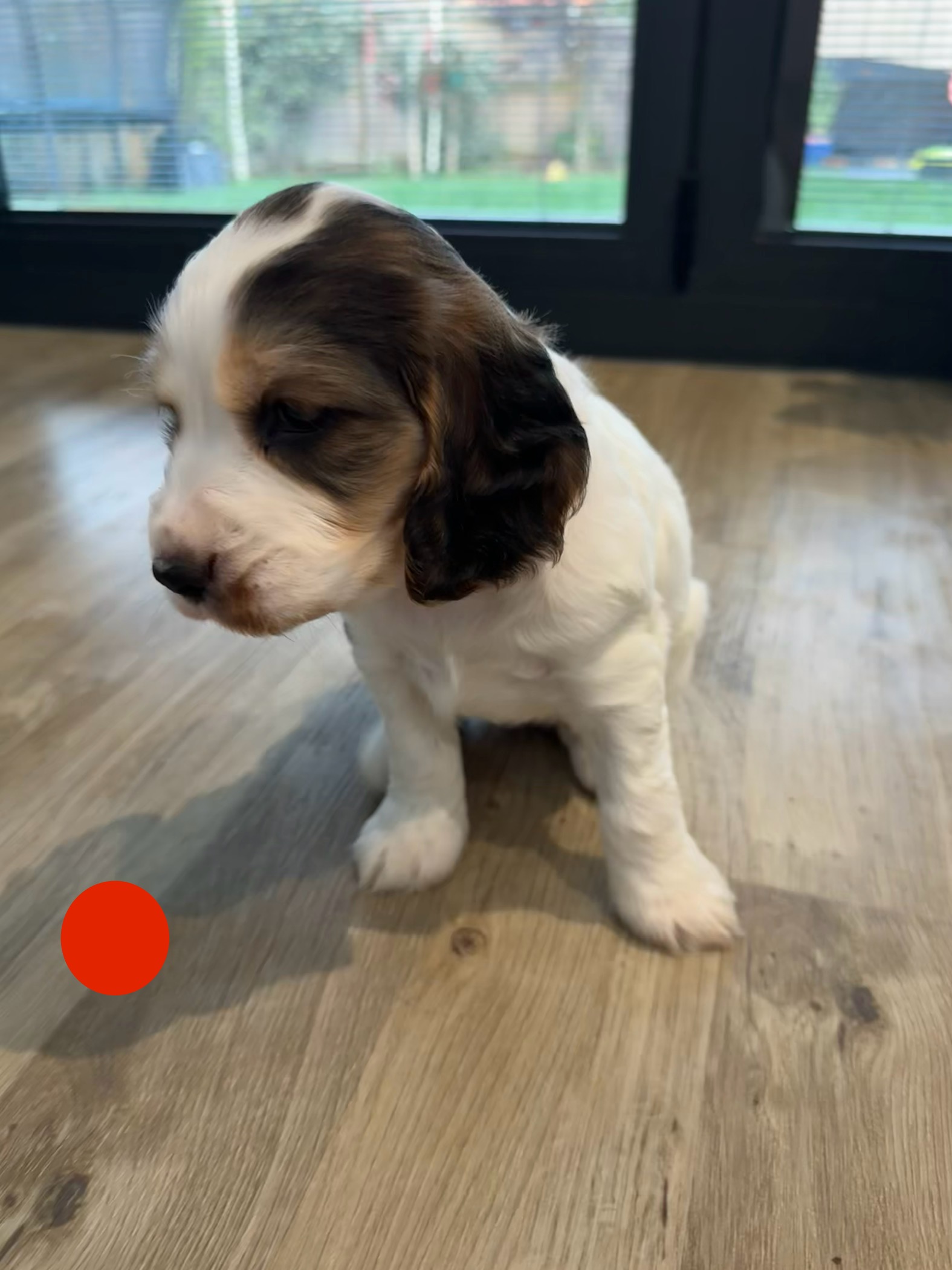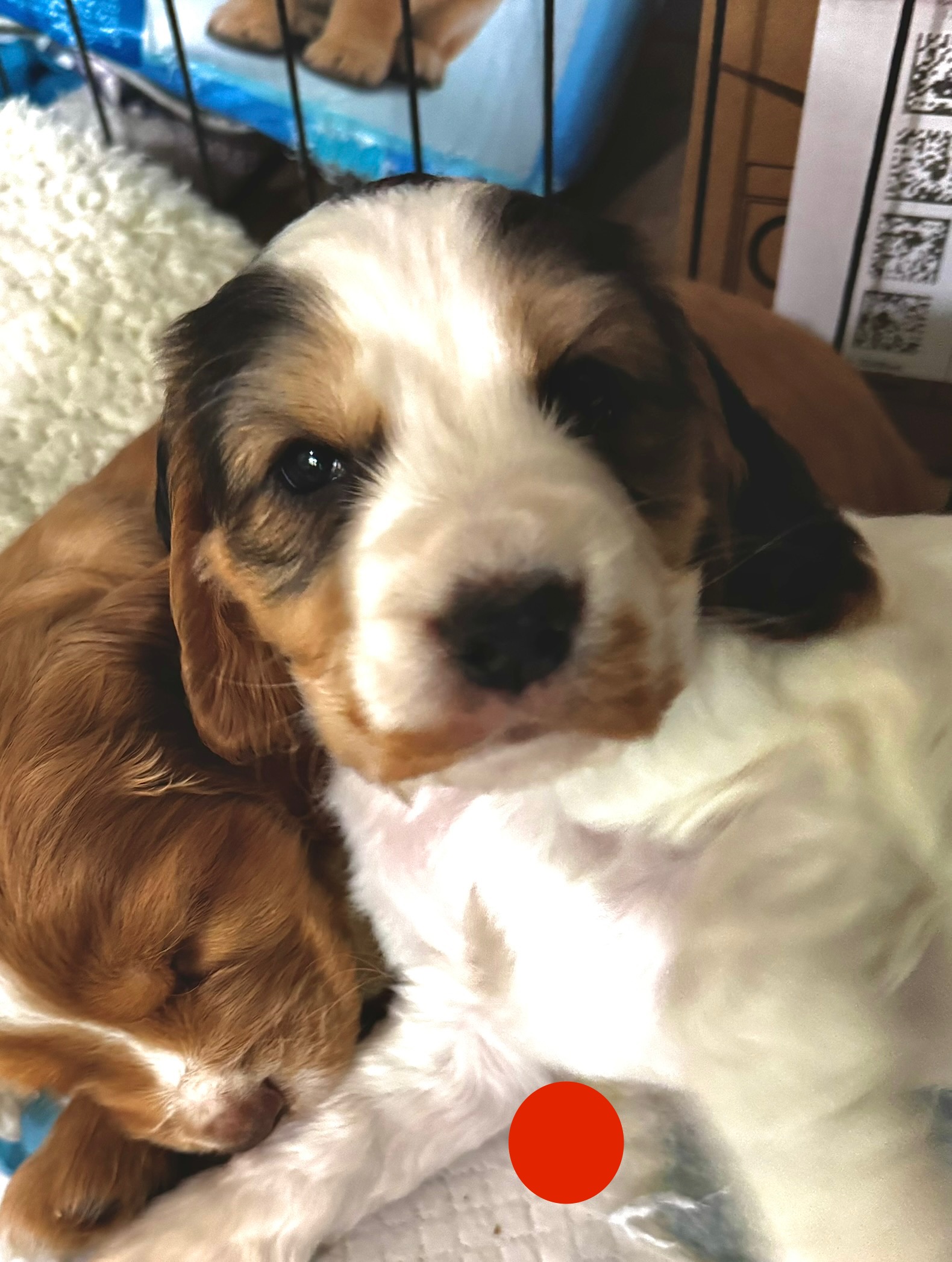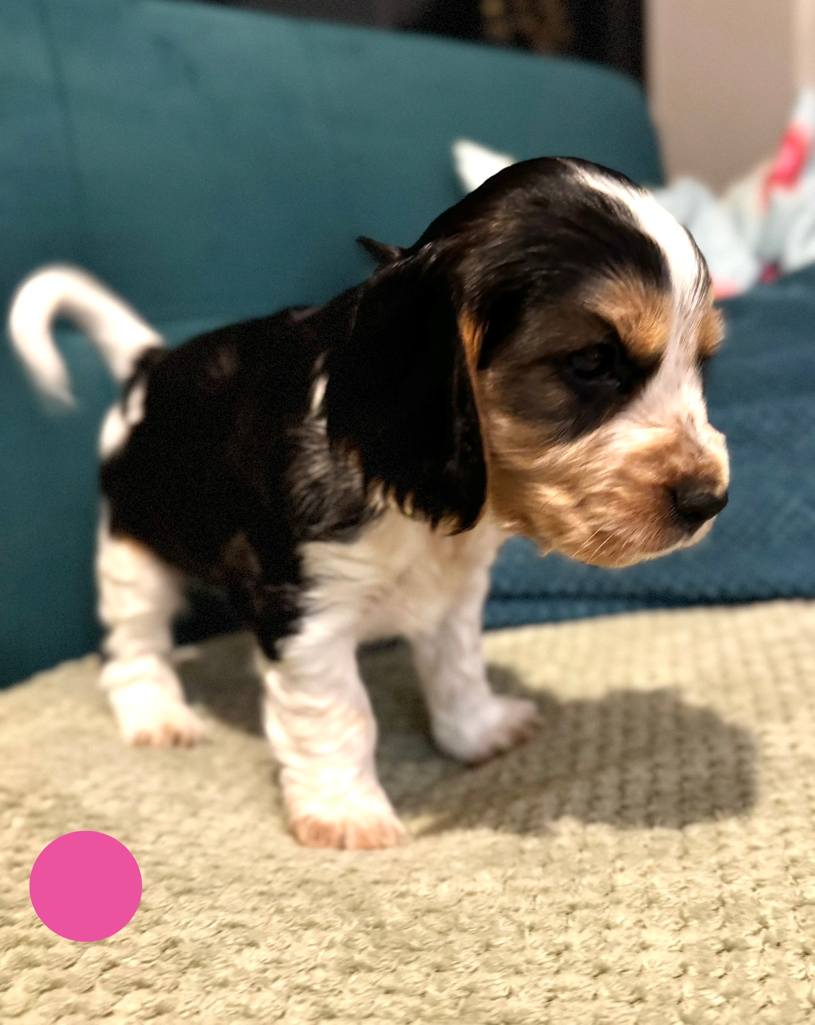 Nala is a dream dog with lots of energy (like all working cockers), loving temperament, great with our kids and cats, and loves a cuddle. She is white with black sable and tan. Her pregnancy was smooth and she is a super attentive momma.