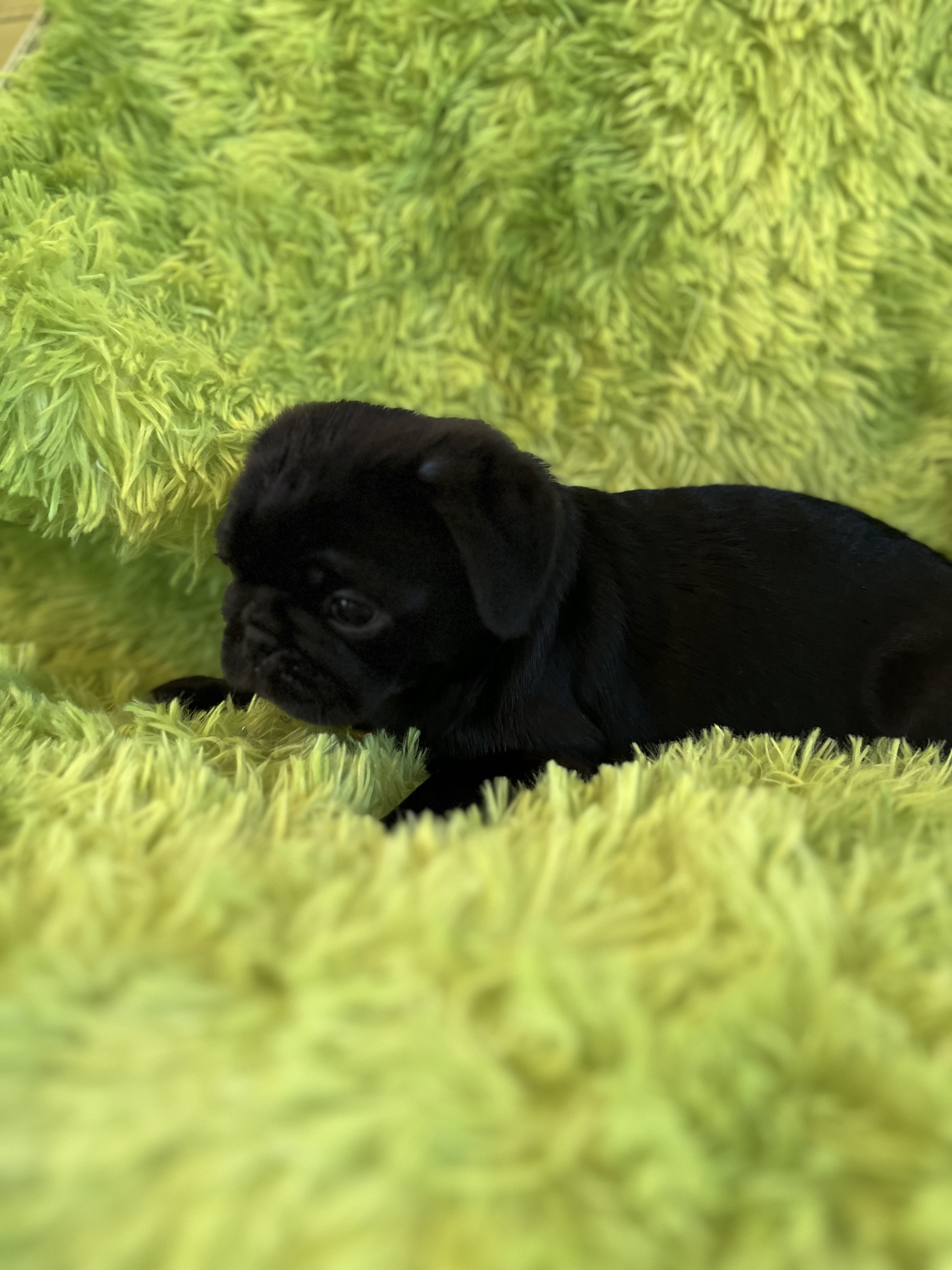 🖤 One puppy is fully black – sleek, sweet-natured, and already showing signs of being a cuddly lap dog.