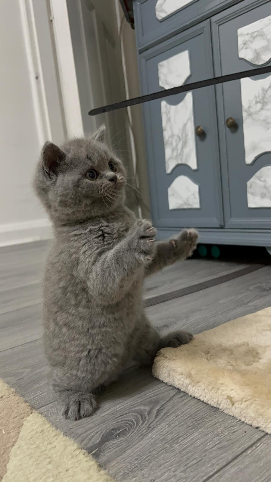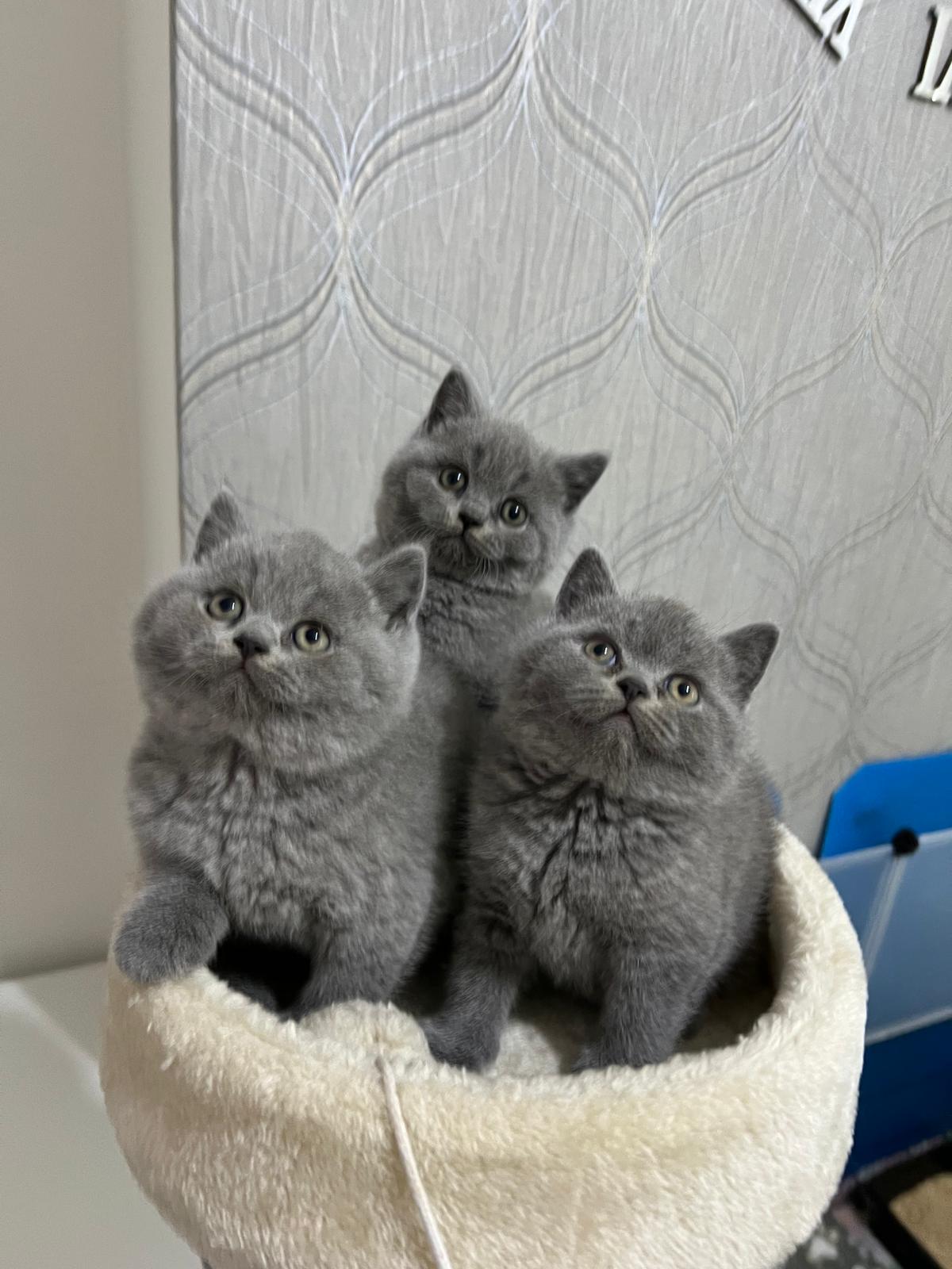 Three adorable kittens (Boys) are available for sale. These Blue British Shorthair kittens are thriving, playful, and full of energy. Each one has a charming personality and has been raised in a loving environment with other cats and children, making them well-adjusted to the sounds of family life. They enjoy both dry and wet food.